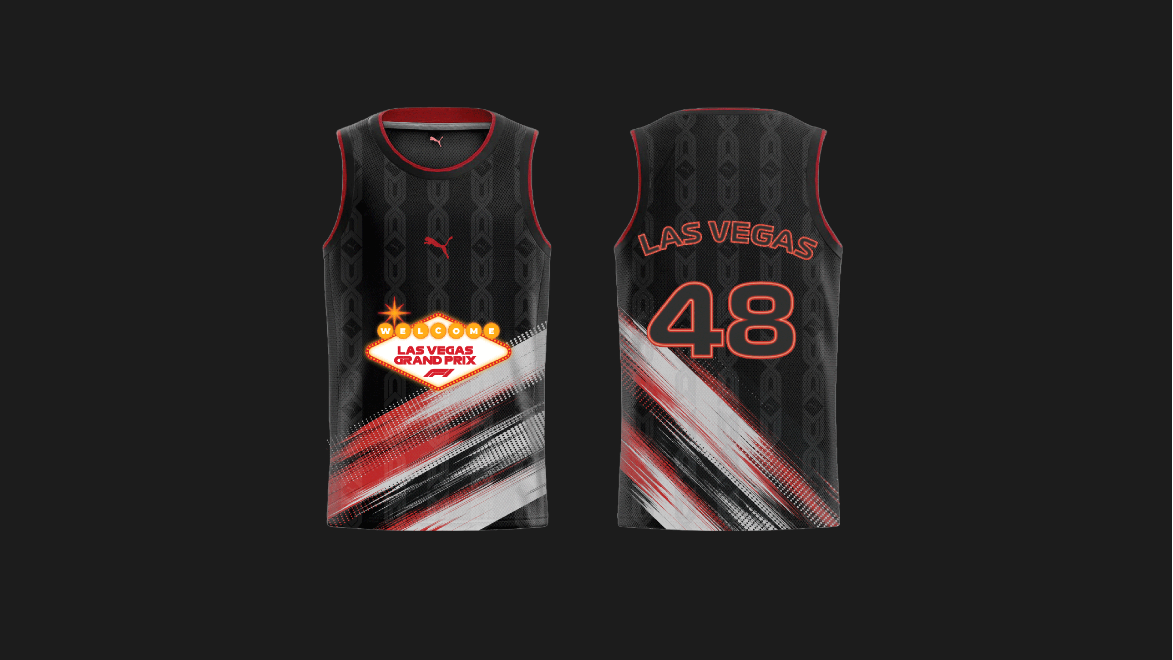 Graphic design concept for a Formula 1 fan capsule developed around the Las Vegas Grand Prix 2025, created under PUMA's motorsport umbrella.This piece explores the intersection of Formula 1 adrenaline and the neon chaos of Vegas, designed for global Ferrari fans who love bold graphics, nightlife energy, and streetwear drops.