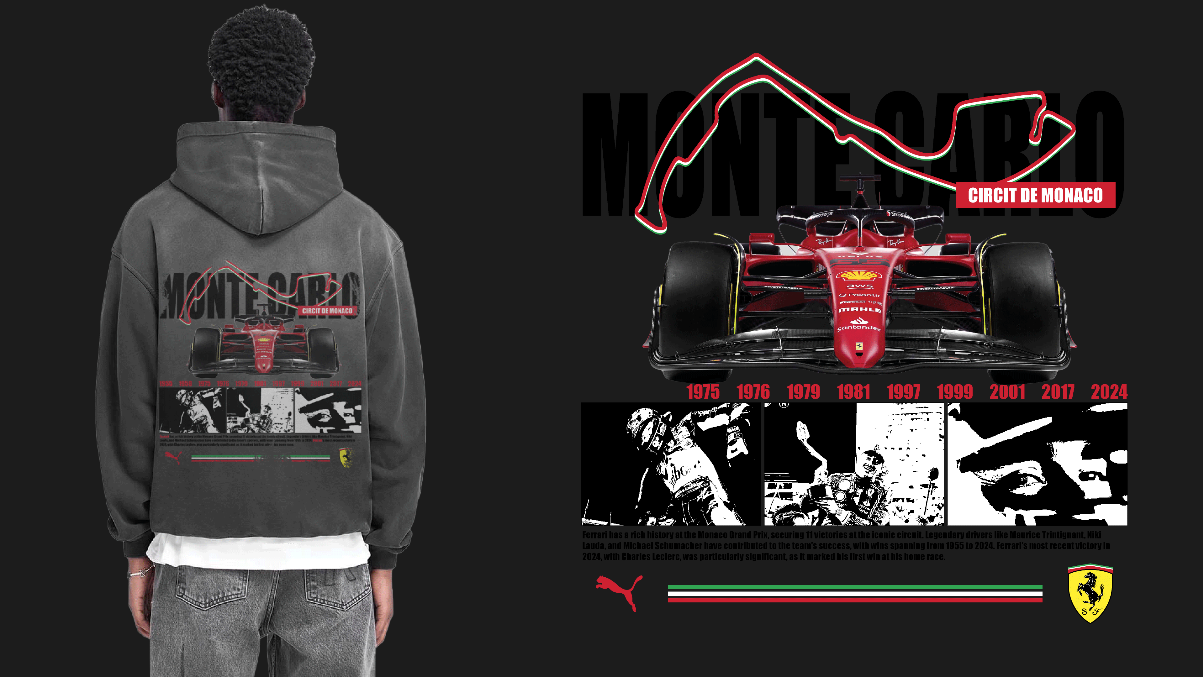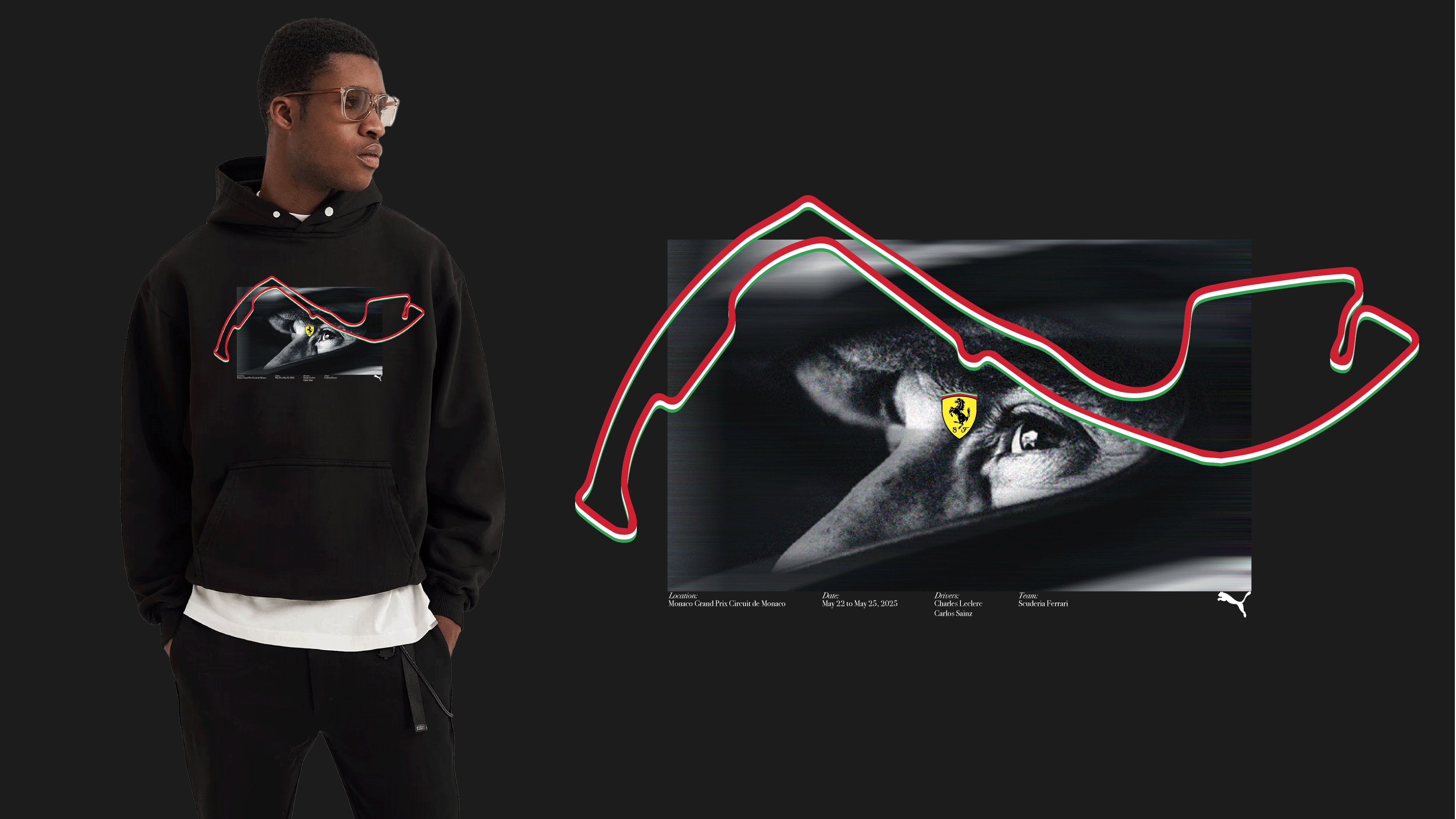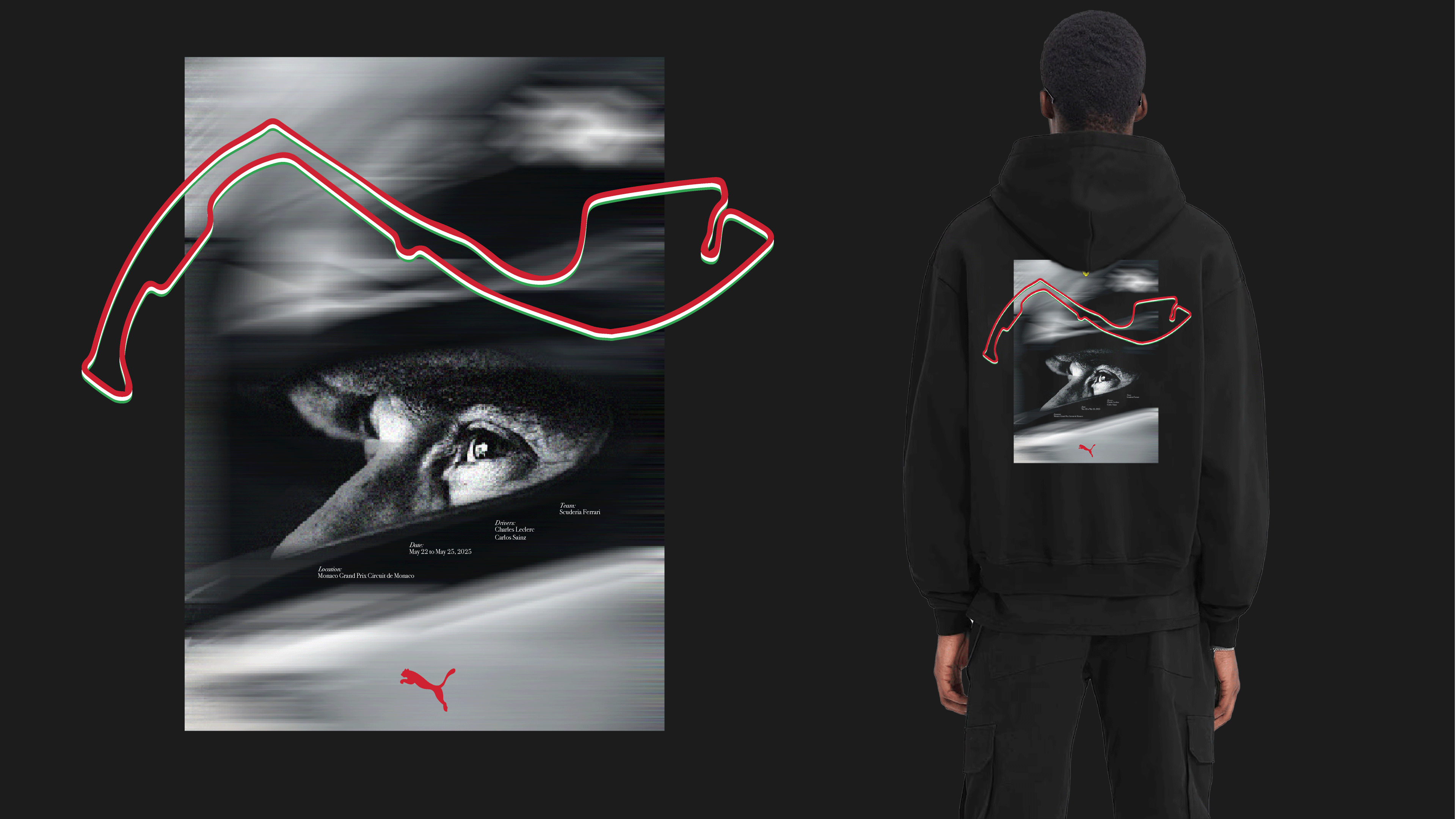 Graphic design concept for a PUMA Ferrari capsule created for the Monaco Grand Prix 2025.Targeted at Ferrari fans, car culture lovers, and streetwear enthusiasts, the design channels the vibrant energy of Monaco with bold shapes, racing-inspired typography, and high-contrast visuals.