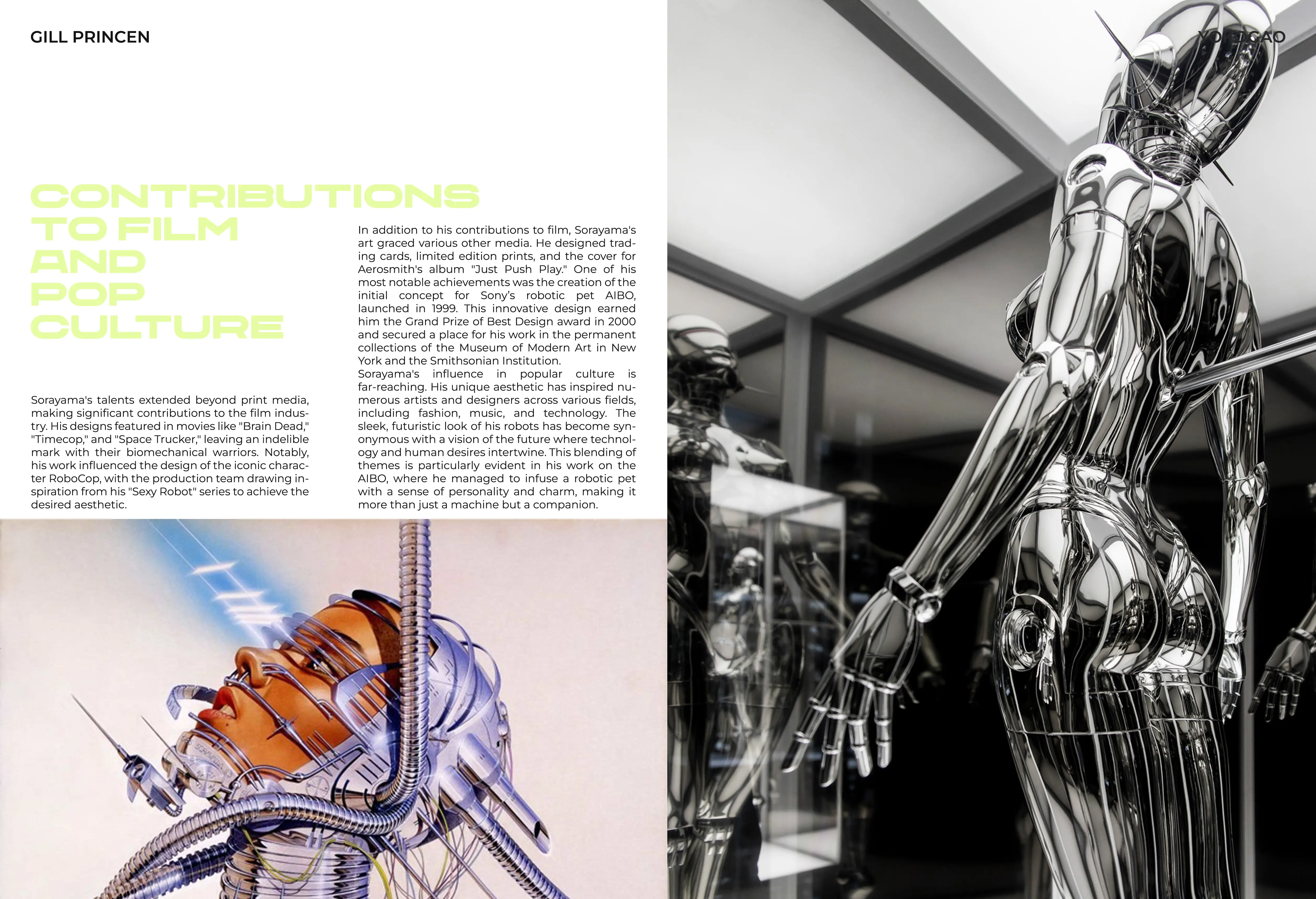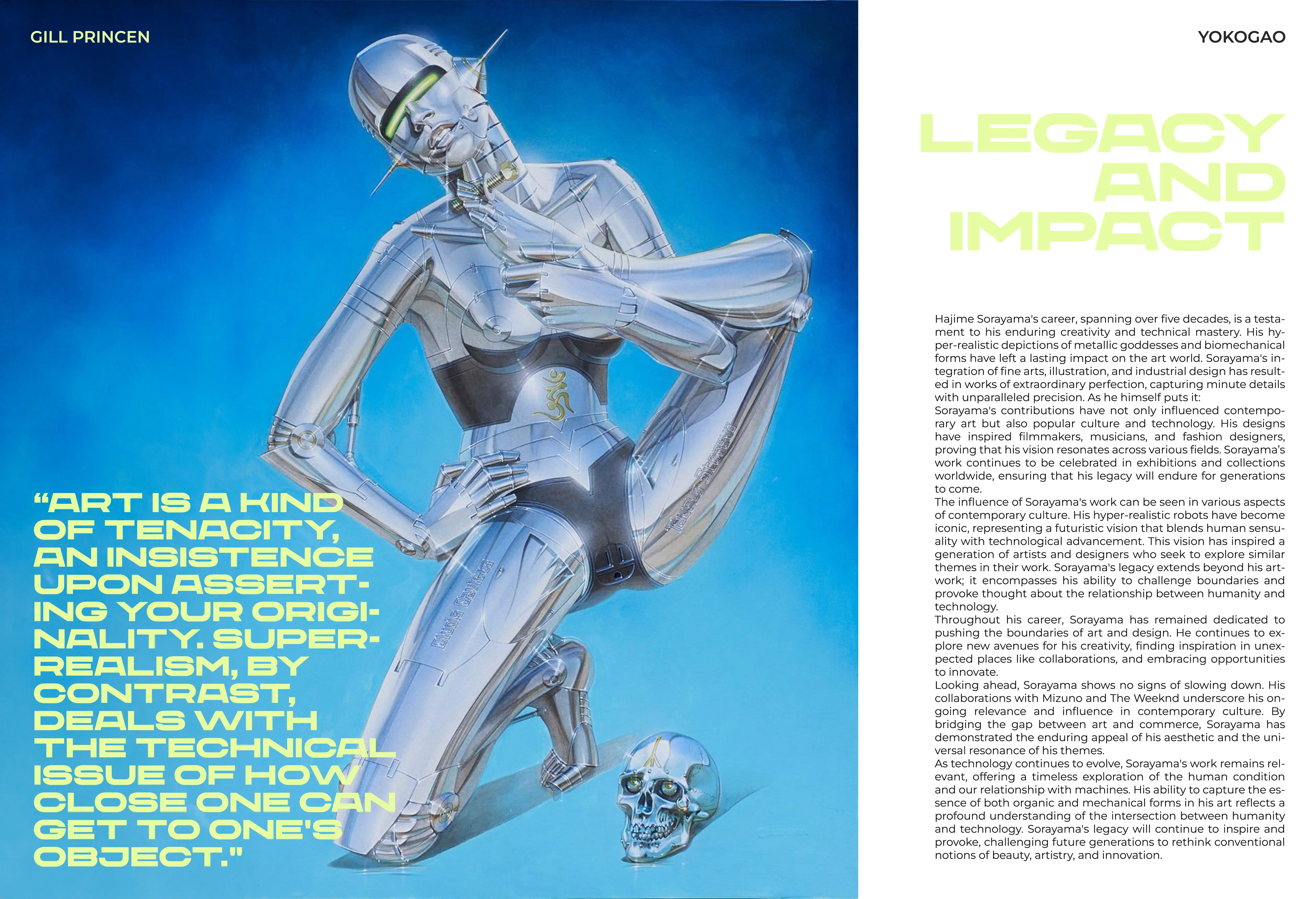 I created a custom print layout that brings my vision to an article about the legendary Japanese artist Hajime Sorayama, written by Gill Princen. Sorayama’s iconic, futuristic artwork was a huge inspiration for this design, where I focused on capturing his unique style in a print-ready format that enhances the reading experience.