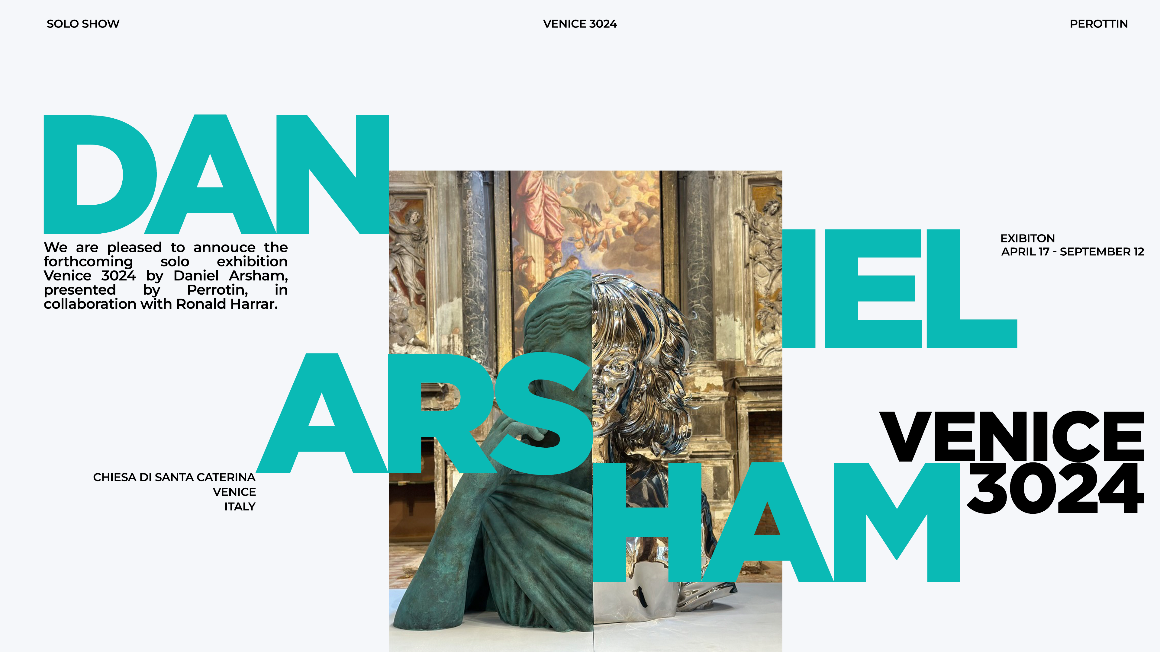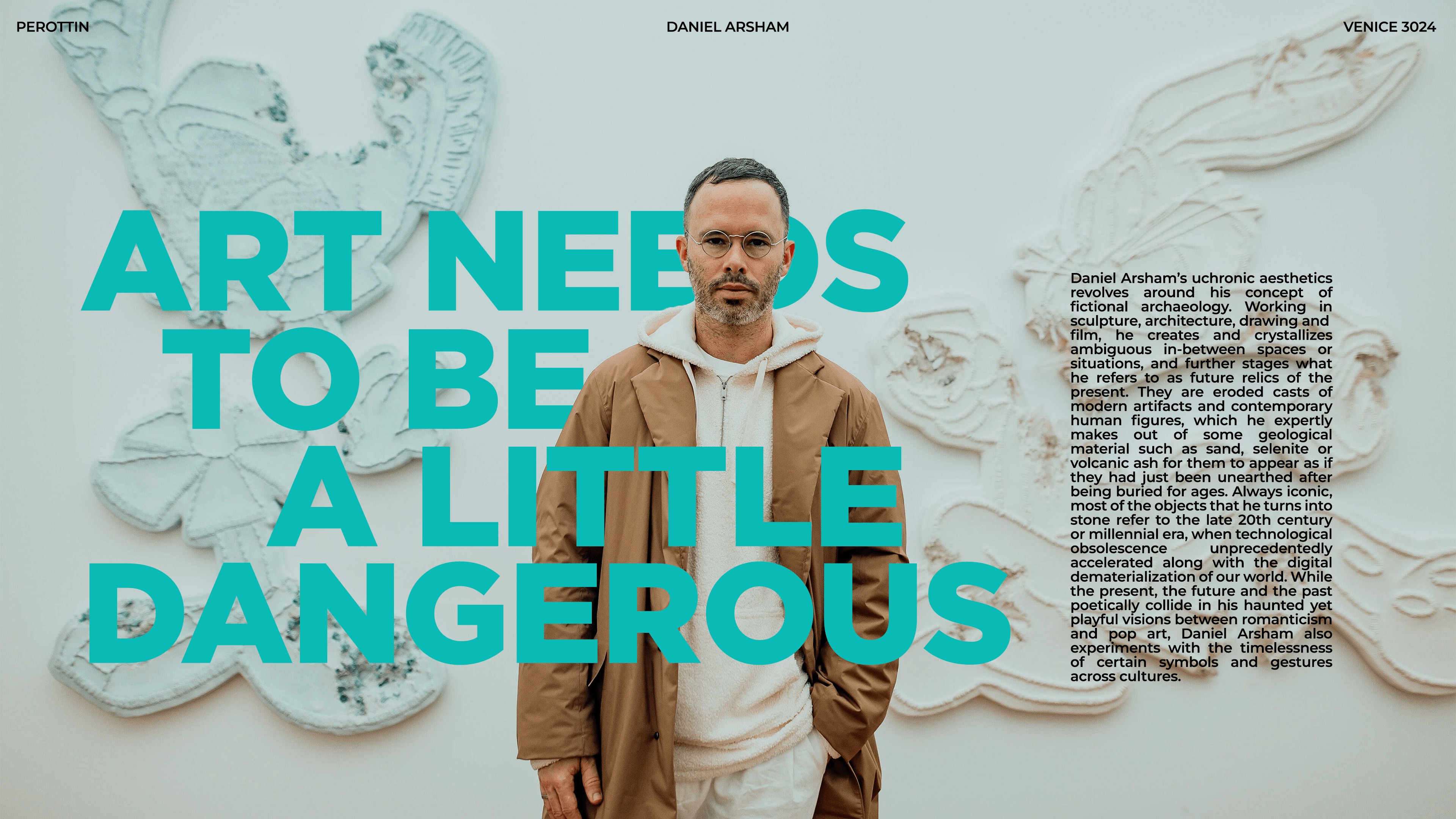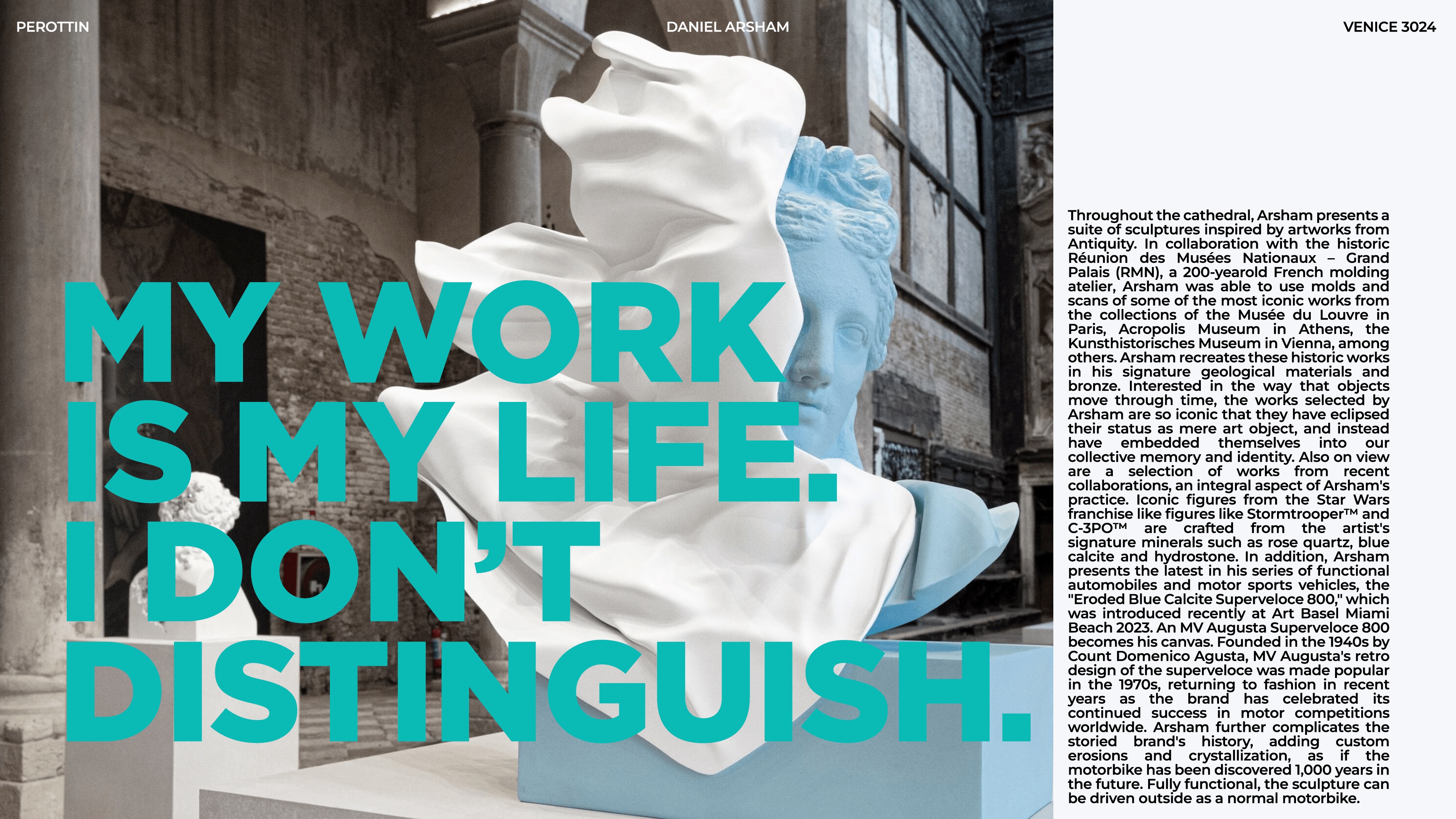 Inspired by Perrotin New York's article on Daniel Arsham's Venice 3024 exhibition, I visited the exhibition and created my own layout for the article. This design captures the futuristic essence of Arsham’s work, blending clean typography and dynamic visuals to reflect the innovative atmosphere of the show. It's a fresh take on the original article, with my unique design perspective shaping the narrative.